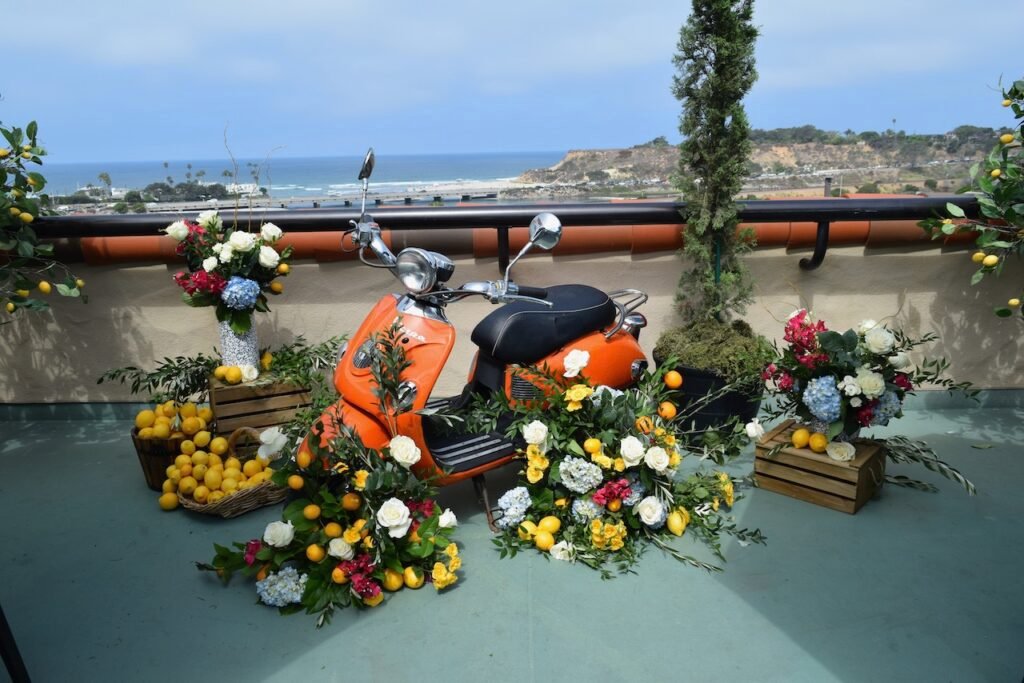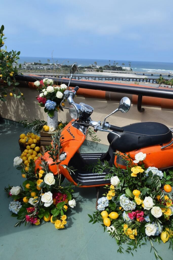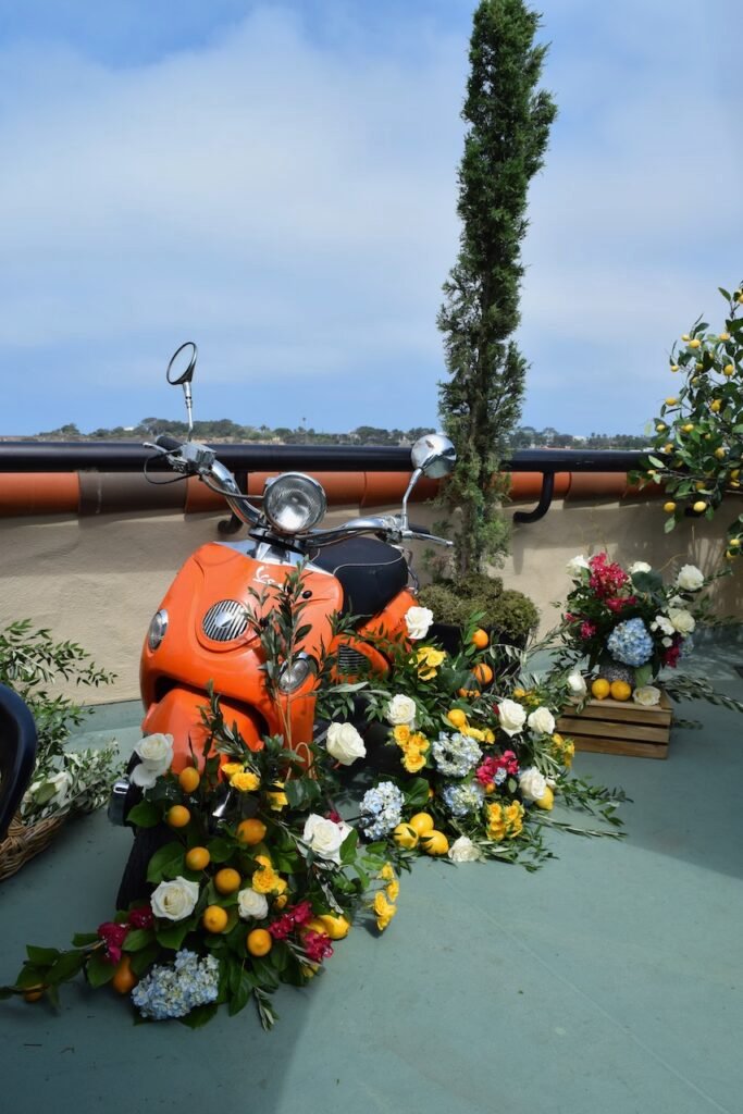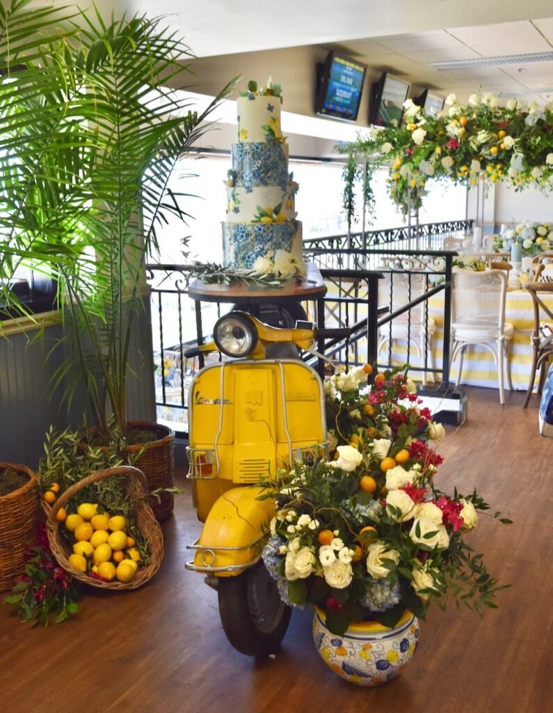 To the righthand side, find the Heritage Desserts cake on display, atop one of the Vespas, and surrounded by overflowing florals in Italian-inspired ceramics, with baskets, topiaries, oranges, lemons.