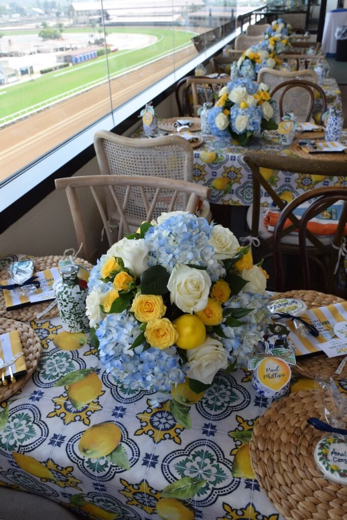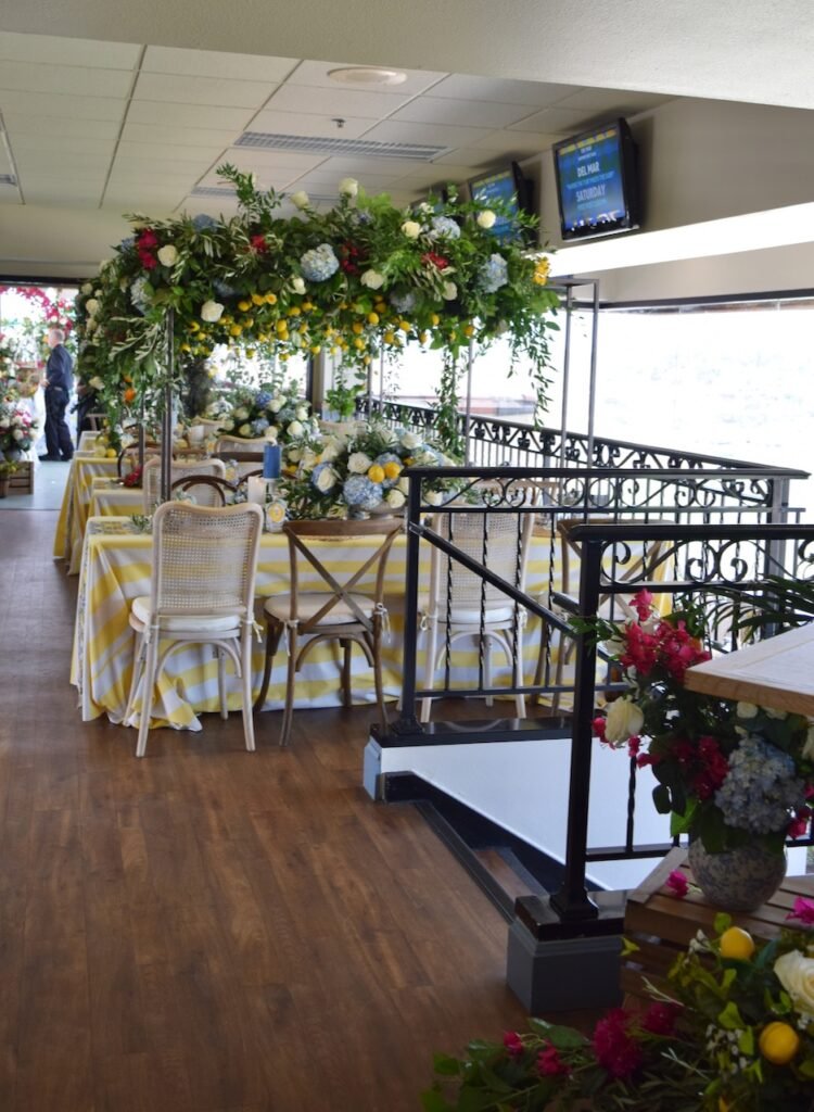 The lower deck was cleaner and uniform, to keep the large windows without obstacles for viewing the races. The color scheme in white, blue and yellow popped for summertime. These compote size centerpieces were gorgeous.