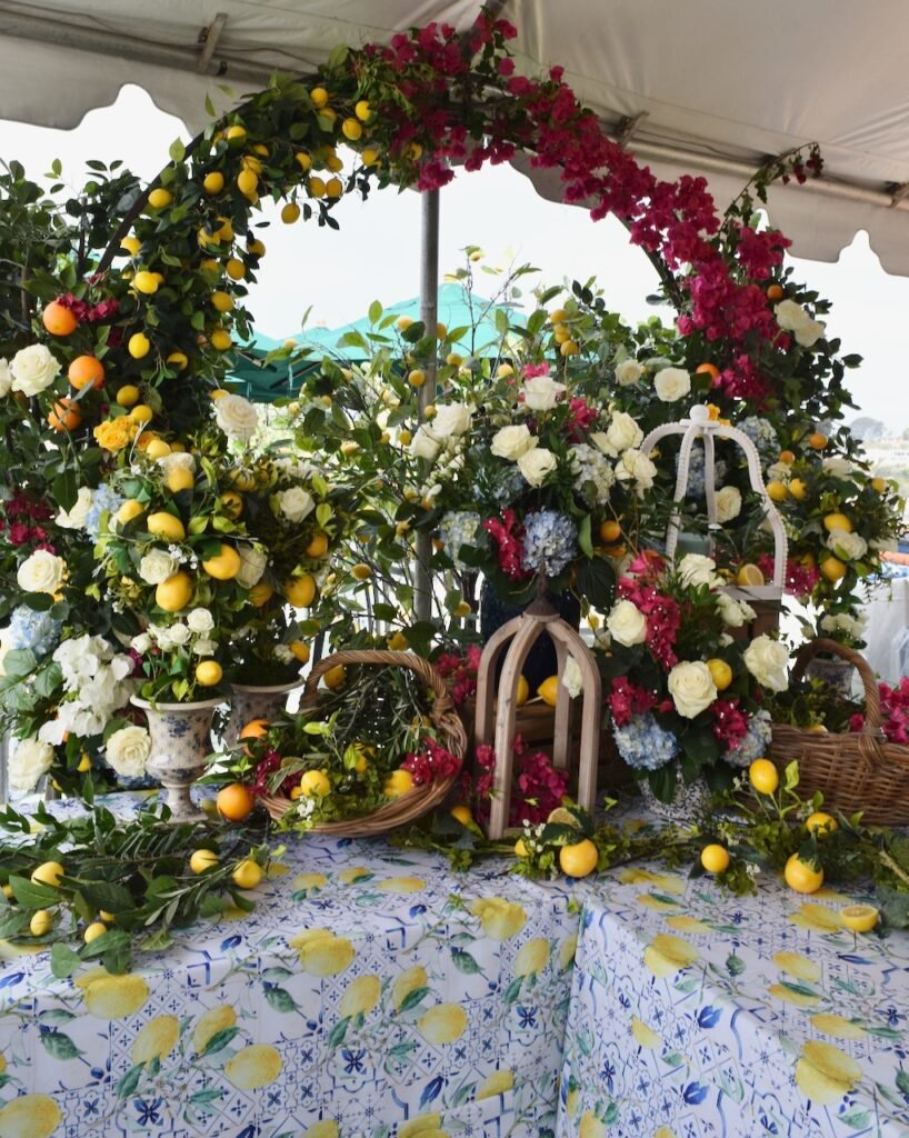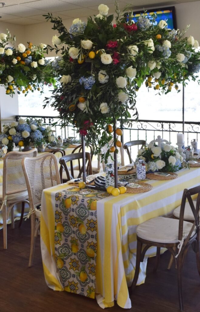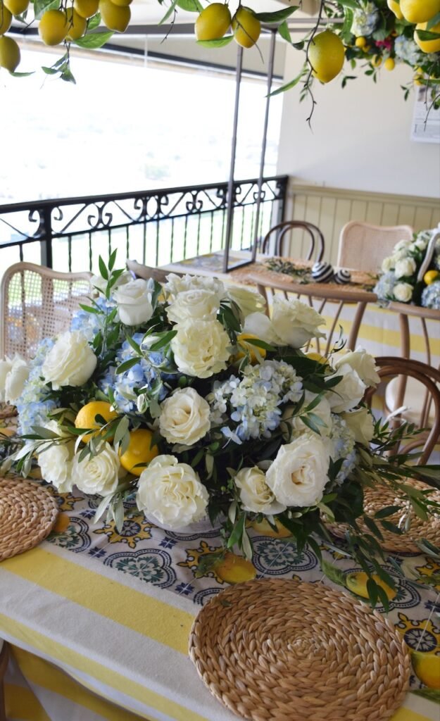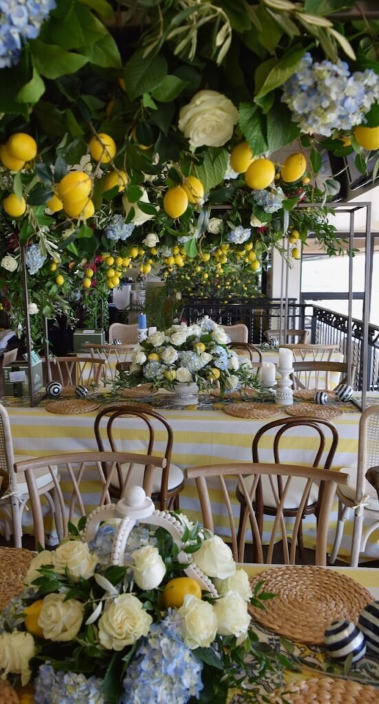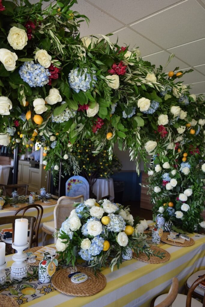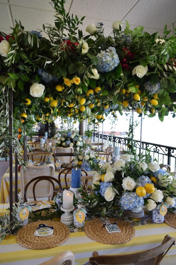 Above-head florals were segmented to be styled slightly different – some with oranges and bougainvillea alongside Italian-inspired greenery, white roses, and blue hydrangea – all with iconic lemons hanging down to speak to the Amalfi Coast.