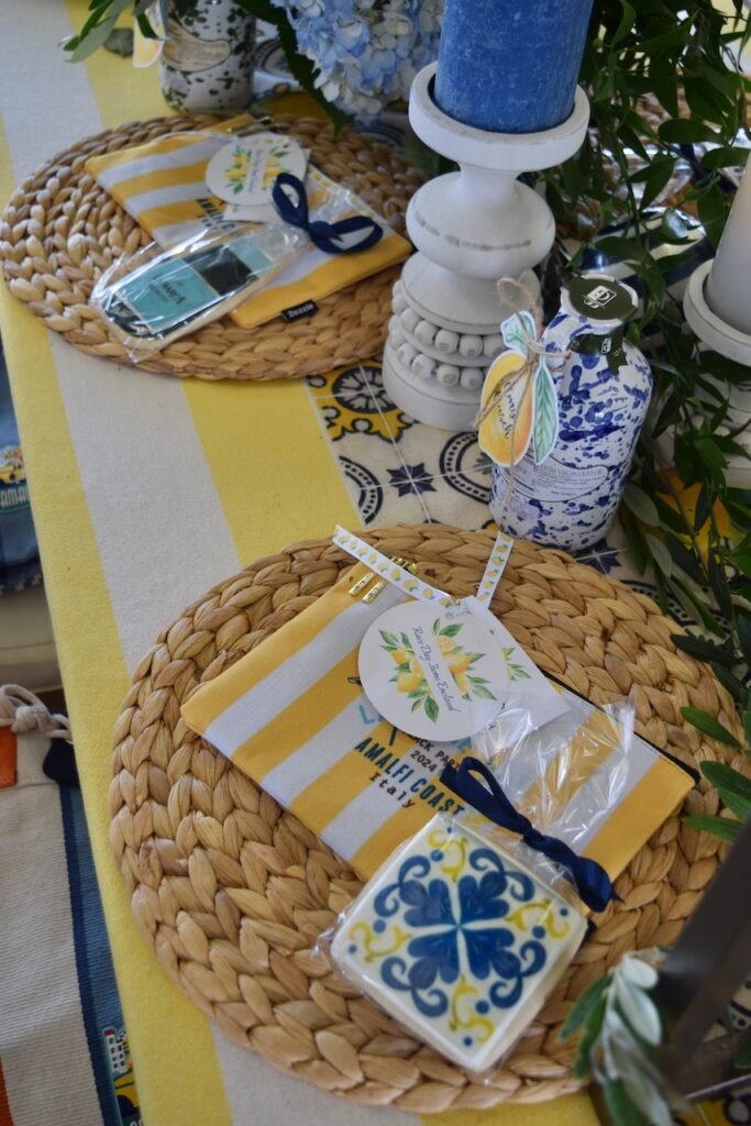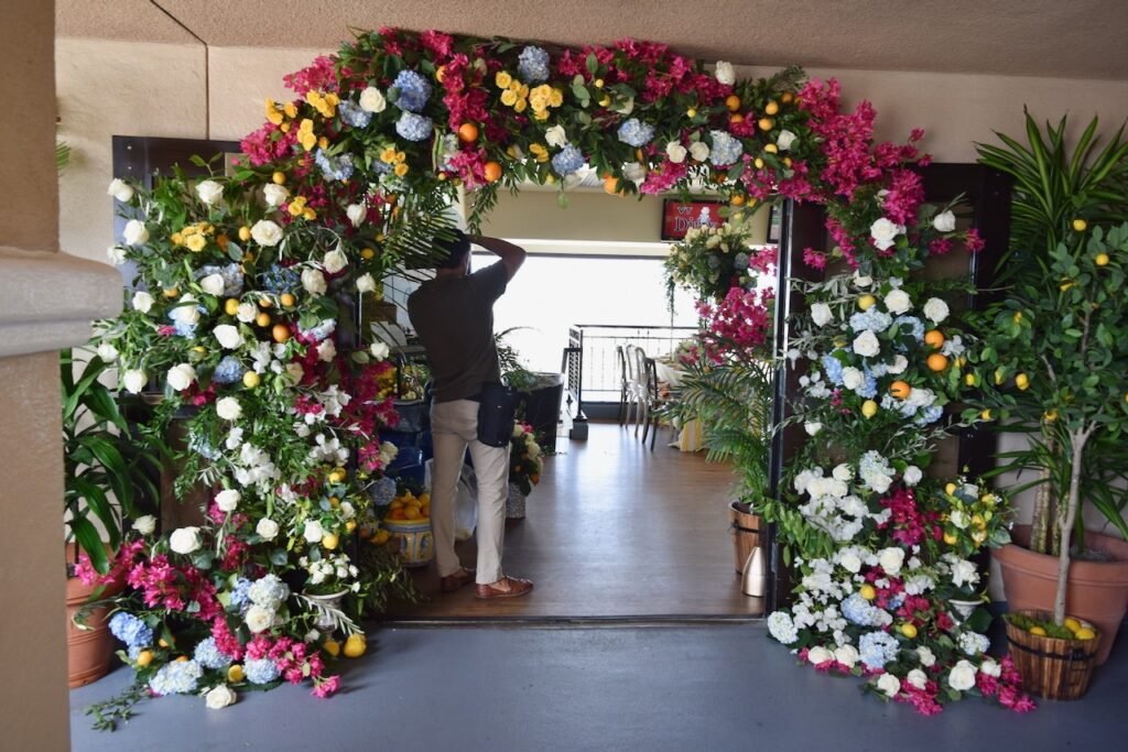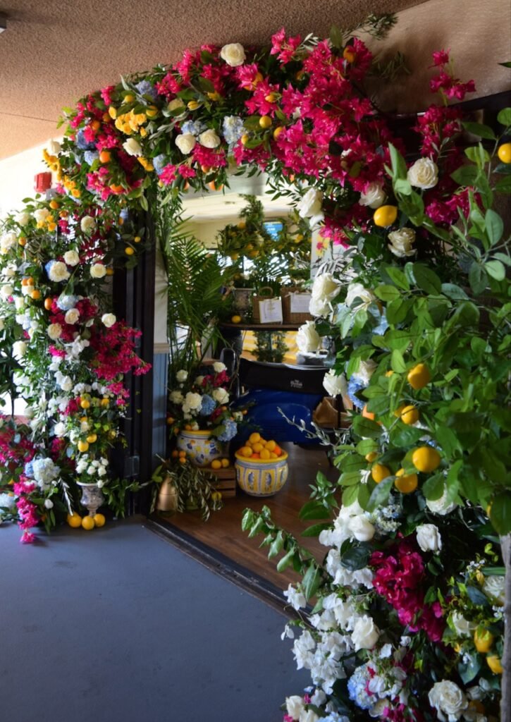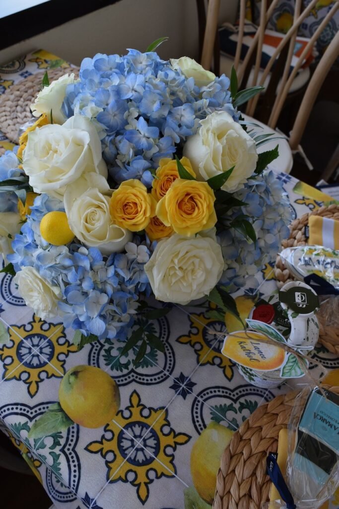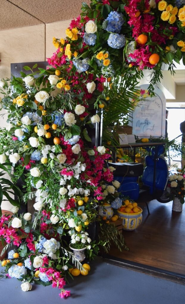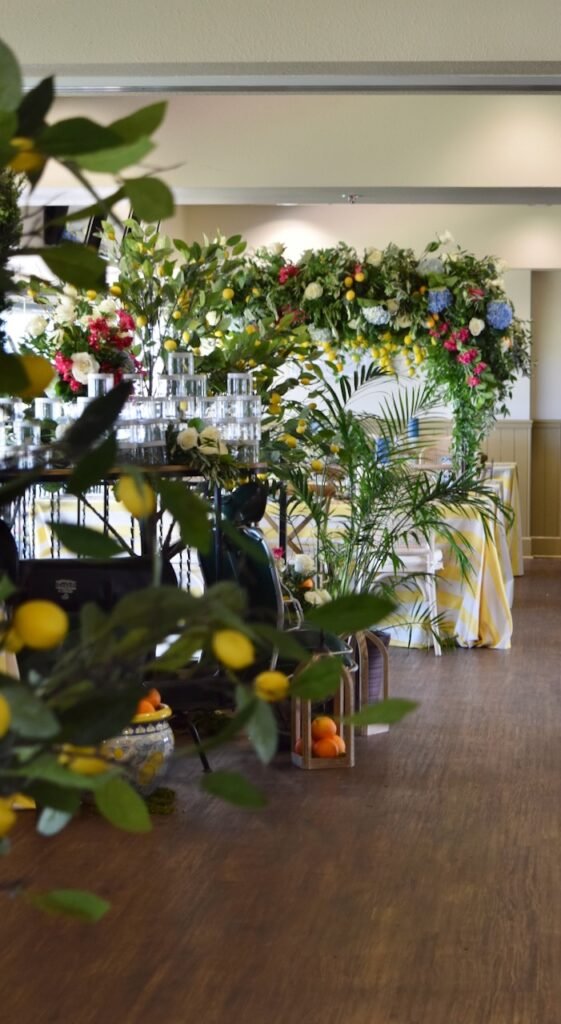 Above-head florals were segmented to be styled slightly different – some with oranges and bougainvillea alongside Italian-inspired greenery, white roses, and blue hydrangea – all with iconic lemons hanging down to speak to the Amalfi Coast.